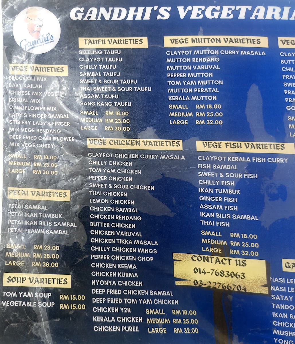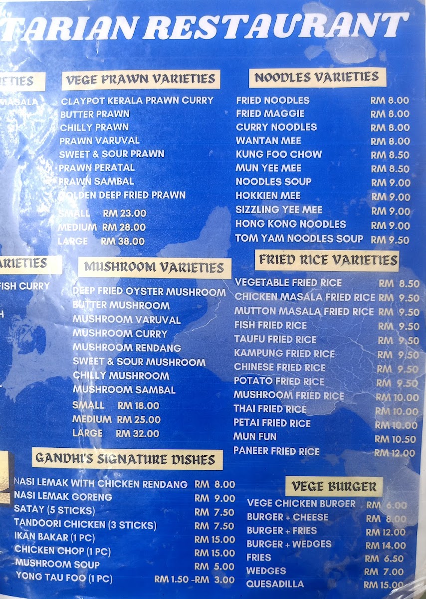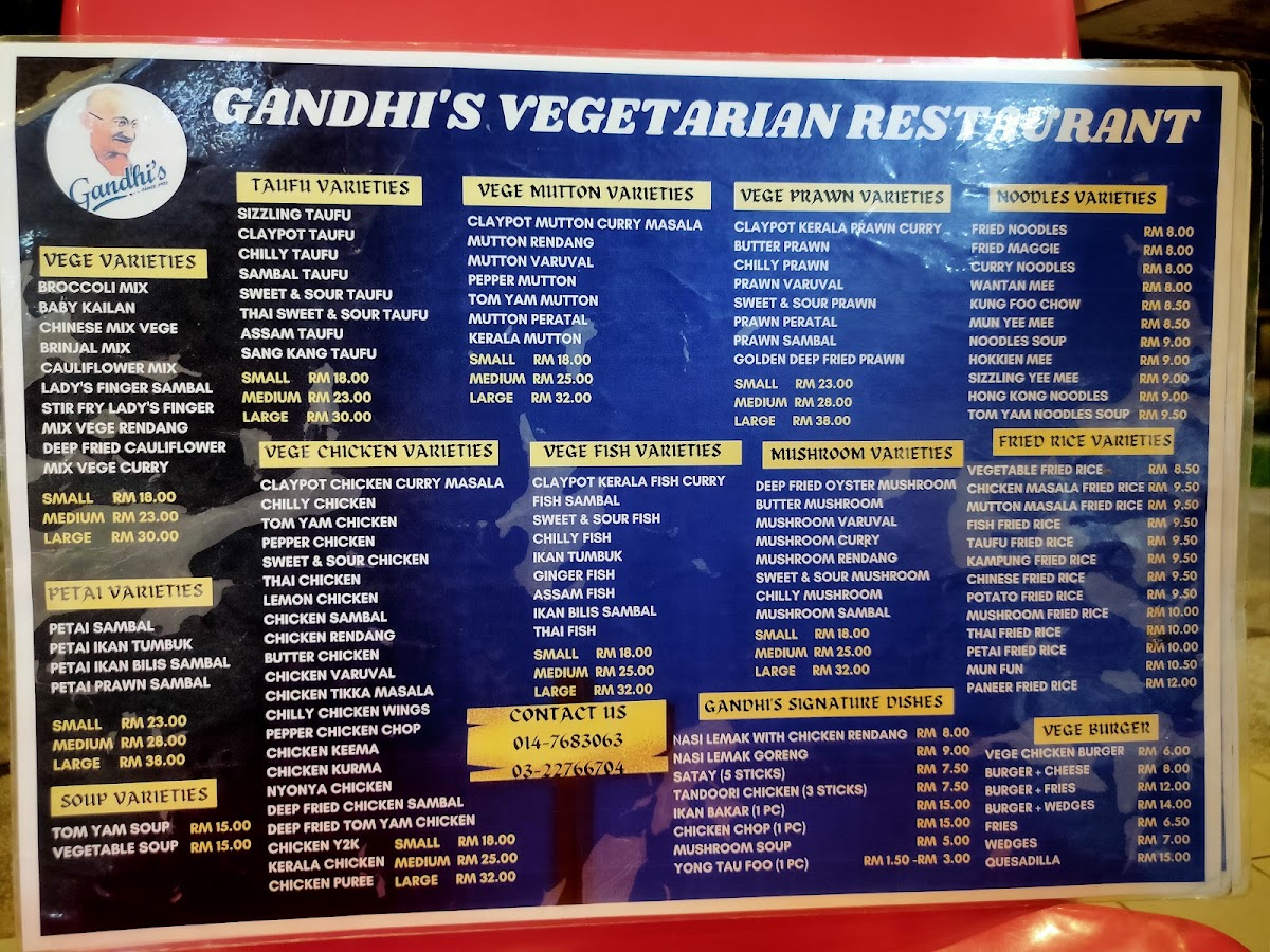 Introducing the menu at Gandhi's Vegetarian Restaurant, a hidden gem located in Brickfields, Kuala Lumpur. This cozy eatery offers a delightful array of vegetarian dishes, primarily inspired by Indian cuisine. One of the standout offerings is their Deep Fried Bittergourd, which comes crispy and golden brown, perfectly paired with a tangy dipping sauce. For those looking for a hearty meal, the Vege Taufu Sambal Meal Box serves a satisfying mix of rice, sambal, and assorted vegetables. The menu also features a variety of soups like the Tom Yam Soup, combining spicy and sweet flavors that awaken the taste buds.
